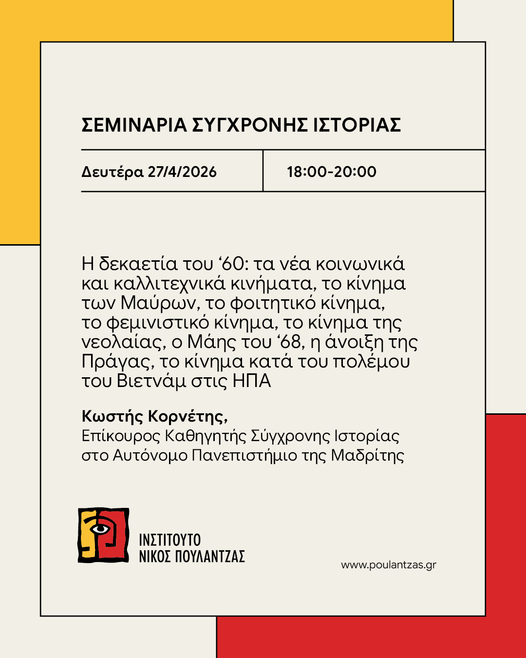 Τετάρτη 29 Απριλίου 2026 | 5:00 – 9:00 μ.μ. | Βιβλιοθήκη Δ.Ι. Πουρνάρας, 2ος όροφος, ΕΣΗΕΑ (Ακαδημίας 20) (Προσέλευση από τις 4:30 μ.μ.) Το Ινστιτούτο Νίκος Πουλαντζάς και το Ινστιτούτο […]