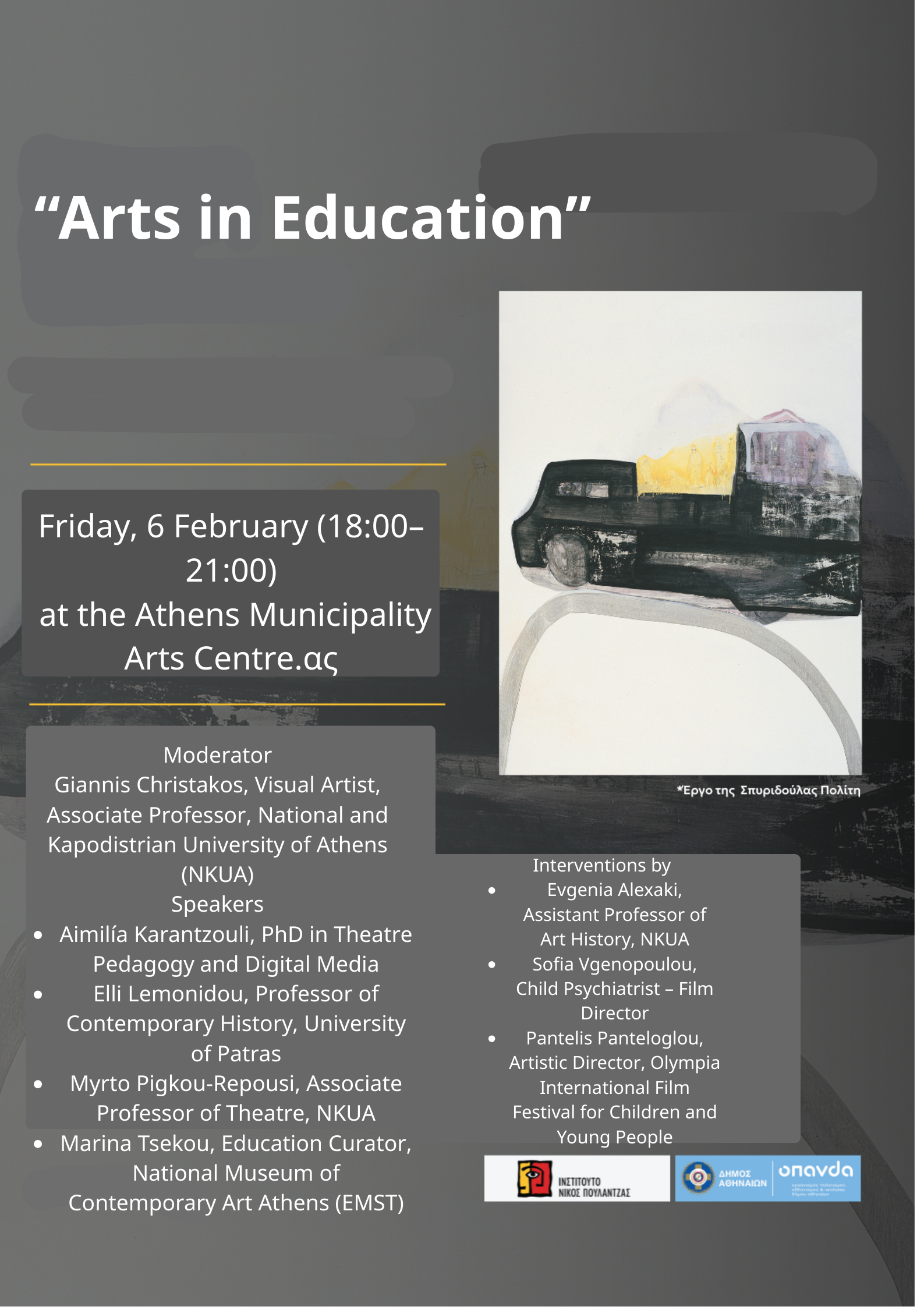 As part of the exhibition “Blind Spot: Sea Routes and Migration Flows”, the Nikos Poulantzas Institute is organising the event “Arts in Education” on Friday, 6 February (18:00–21:00) at the Athens Municipality Arts Centre.
