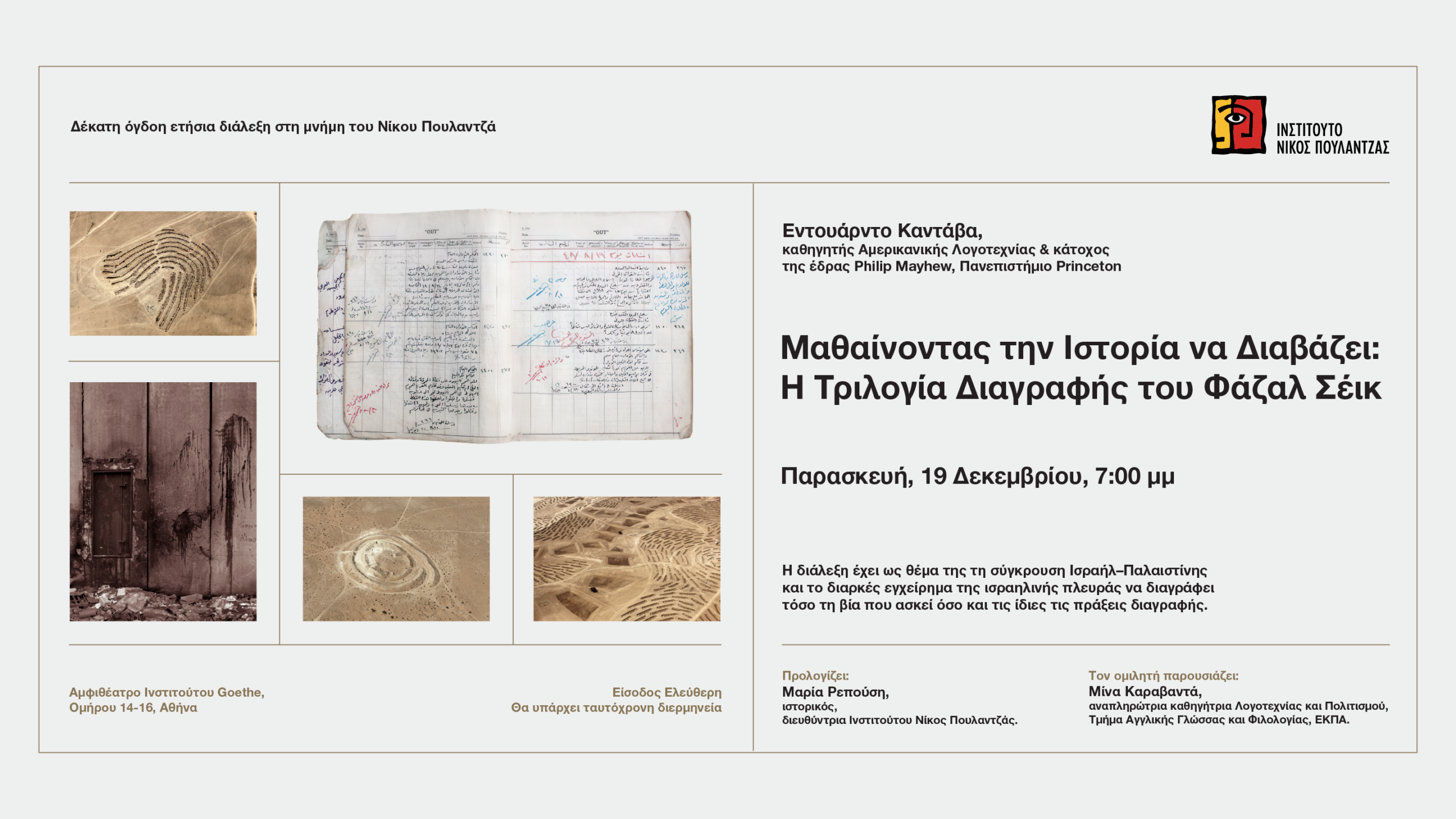 18η ετήσια διάλεξη στη μνήμη του Νίκου Πουλαντζά   Παρασκευή 19 Δεκεμβρίου, 7μμ. Αμφιθέατρο Ινστιτούτου Goethe, Ομήρου 14-16, Αθήνα.  Εντουάρντο Καντάβα Καθηγητής Αμερικανικής Λογοτεχνίας & κάτοχος της έδρας Philip Mayhew, Πανεπιστήμιο Princeton.    Μαθαίνοντας την Ιστορία να Διαβάζει: Η Τριλογία Διαγραφής του Φάζαλ Σέικ Το Ινστιτούτο Νίκος Πουλαντζάς διοργανώνει την 18η ετήσια διάλεξη στη μνήμη του […]