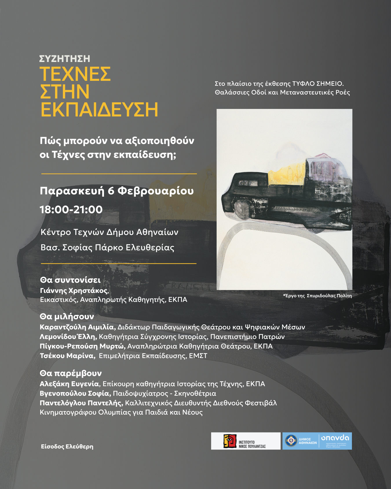 ΤΥΦΛΟ ΣΗΜΕΙΟ: Θαλάσσιες οδοί και μεταναστευτικές ροές Κέντρο Τεχνών Δήμου Αθηναίων | 13 Ιανουαρίου – 8 Φεβρουαρίου 2026 Το Ινστιτούτο Νίκος Πουλαντζάς παρουσιάζει την έκθεση Εικαστικής Ομάδας καλλιτεχνών «Τυφλό Σημείο: Θαλάσσιες οδοί και μεταναστευτικές ροές» στο Κέντρο Τεχνών του Δήμου Αθηναίων, από τις 13 Ιανουαρίου έως τις 8 Φεβρουαρίου 2026. Η έκθεση αποτελεί μια καταγραφή […]